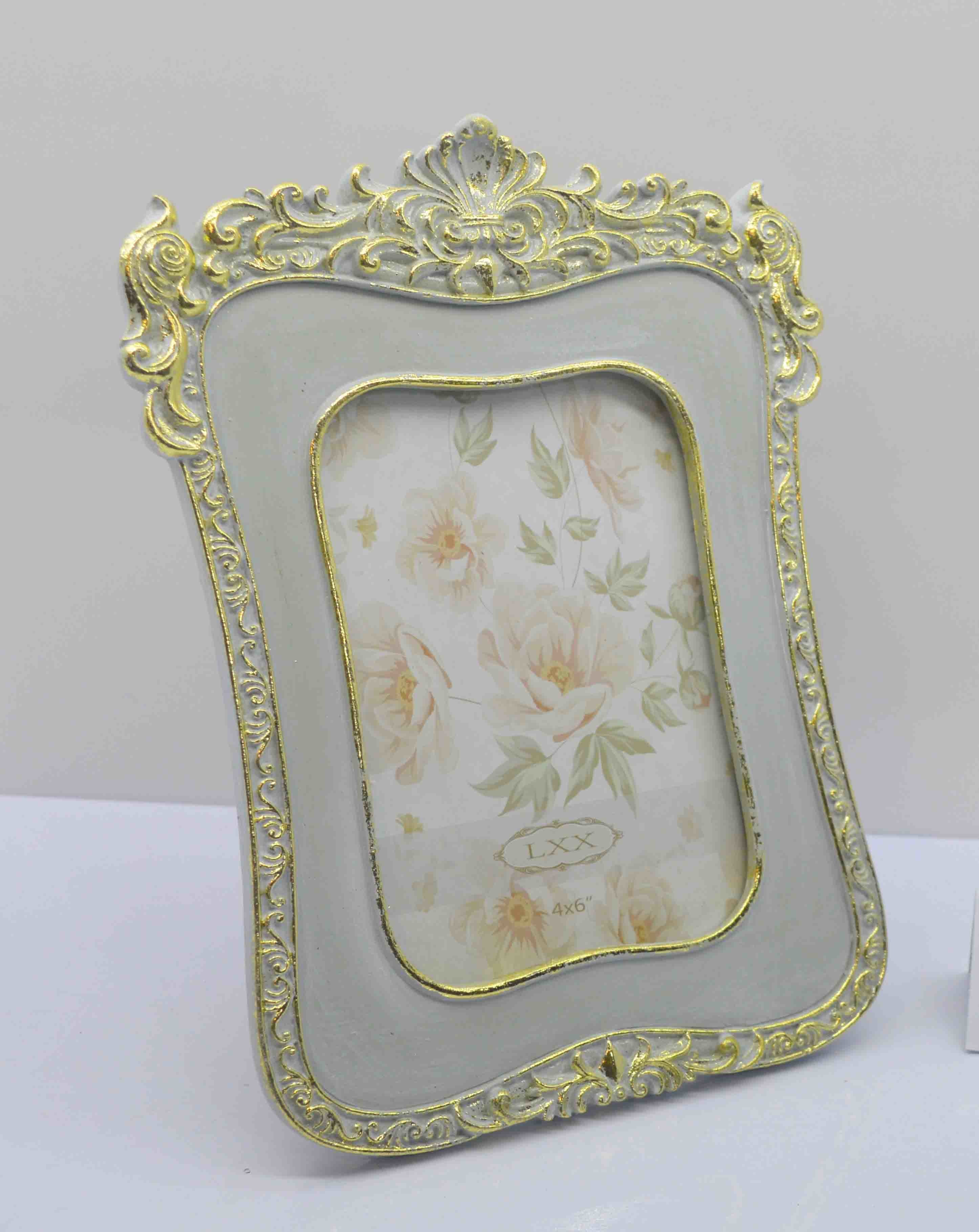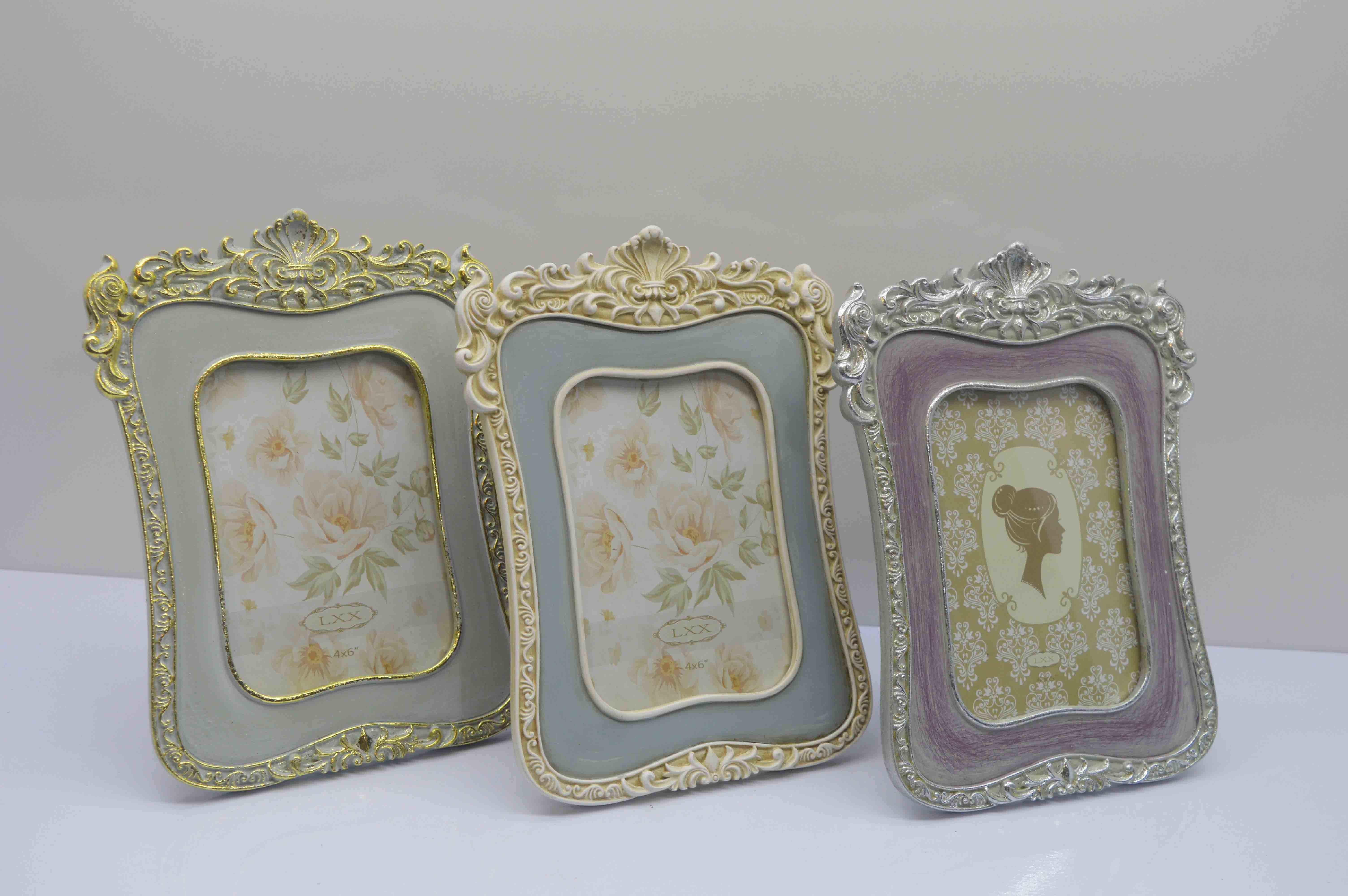 Antique old champagne gold polyresin photo frame, classic baroque crown pattern adorned four corner of the frame. Fine workmanship, match your antique furniture perfectly.